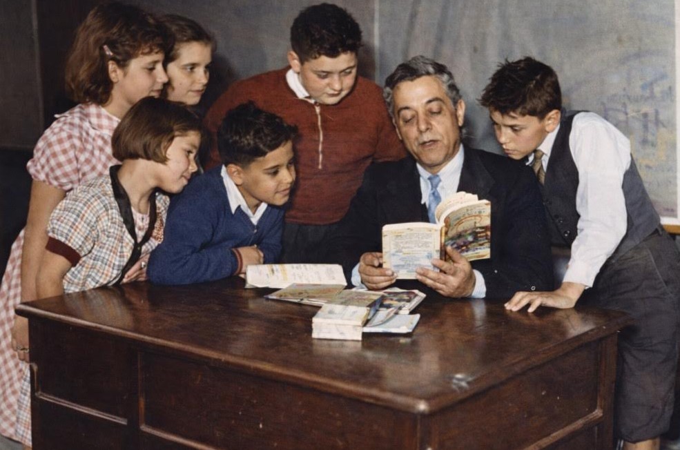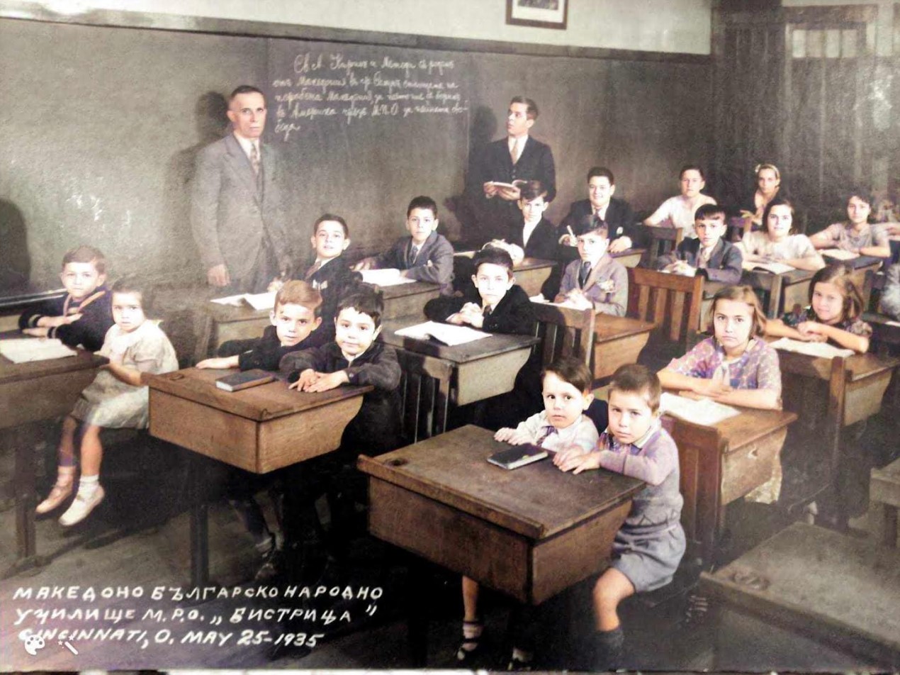 Според Македонския алманахъ, издание на Македонската Патриотична Организация (МПО) от 1940 г., който наскоро беше преиздаден от издателство „Тангра“, първото македоно-българско народно училище в Синсинати е създадено през 1935 г. от местния клон „Бистрица“ на МПО. Учител в училището е бил Иван Петров от село Владово (днес Аграс, Гърция), в покрайнините на Воден (днес Едеса, Гърция).