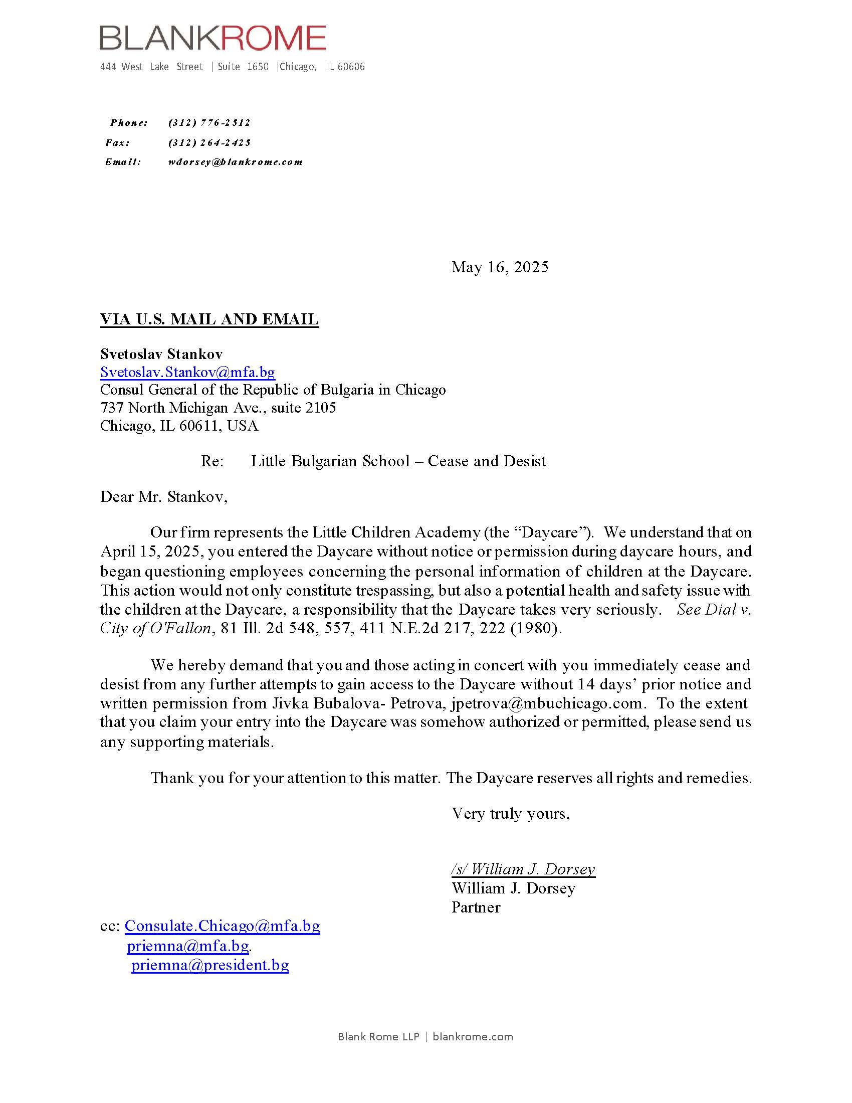 Той получава и писмо cease and desist от името на Петрова, с което адвокатите й казват, че той няма право да влиза в нейното училище и че трябва да поиска двуседмично позволение. Това на практика би обезсмислило всяка проверка, какви по закон генералният консул е длъжен да прави. Интересното е, че писмото е изпратено от кантората Blank Rome и адвокат Уилям Дорси, които представляваха и интересите на бизнесмена Михаил Михайлов при придобиването на сградата на храма “Св. Иван Рилски” в Чикаго. Сега председател на борда на църквата е сина на Петрова - Георги Петров, който е и изпълнителен директор на МБУ.