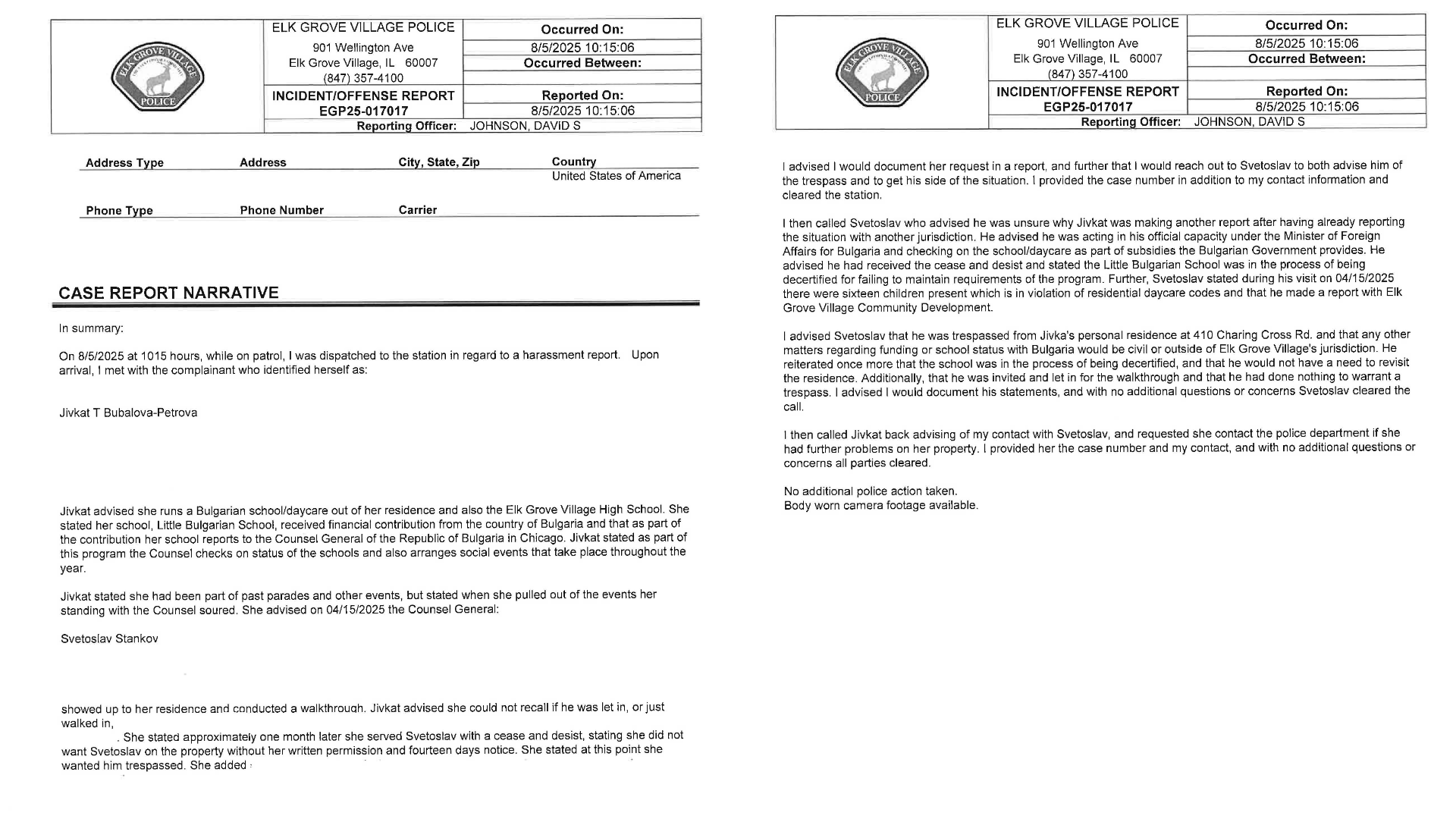 за незаконно влизане в частен имот, показват документи от полицията в чикагското предградие Елк гроув вилидж, предоставени на BG VOICE. Тя се опитала да представи пред властите проверката на Станков като незаконно влизане в нейната къща където се помещава “Мечо Пух”. Още по-интересно е, че сигналът е подаден през август - цели 4 месеца след проверката. Разказът на Петрова е записан на бодикамерата на полицая. След установяване на фактите от полицията в Елк гроув вилидж не предприемат допълнителни действия по случая.