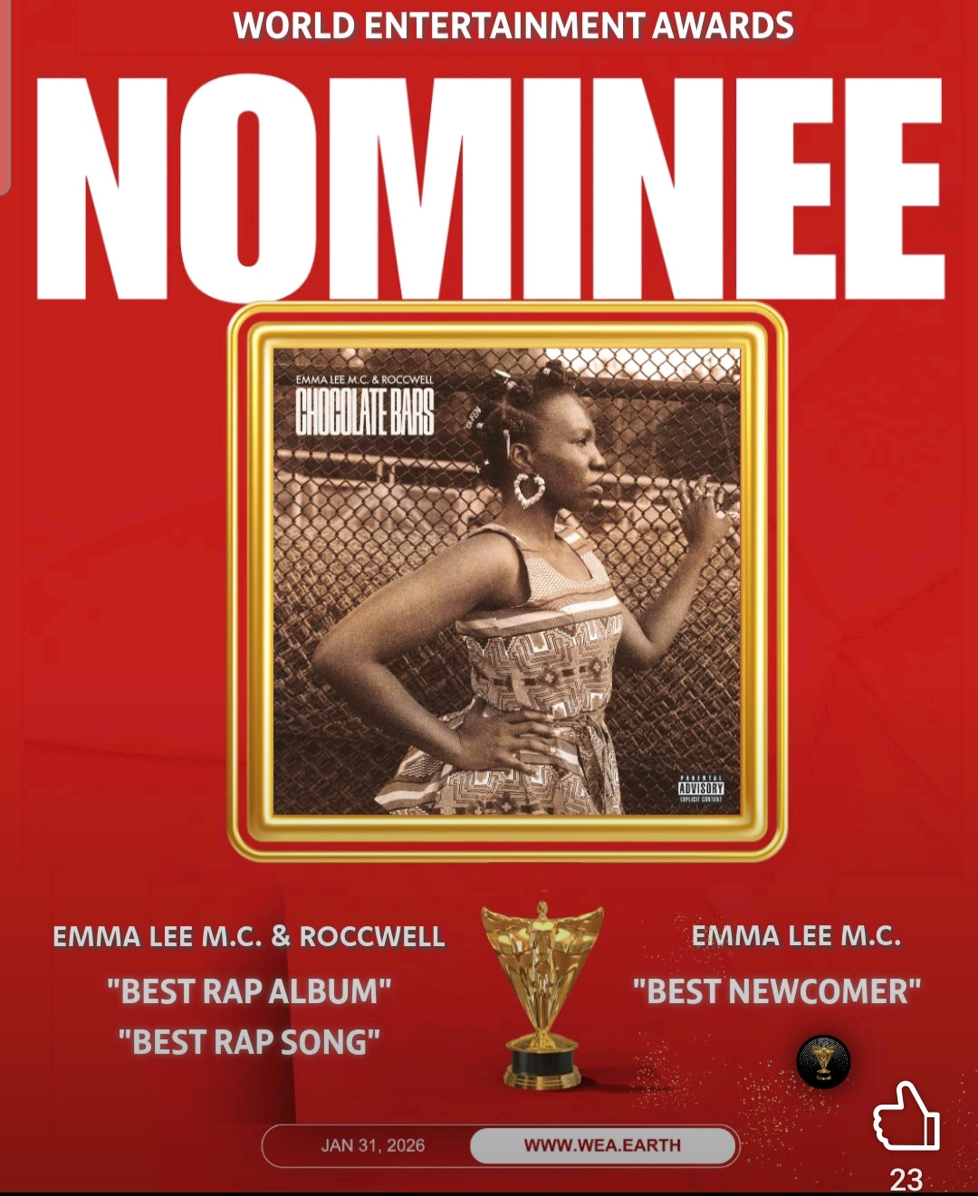 На 15 януари пристига вълнуваща новина за пореден успех на негова възпитаничка. Рап певицата Emma Lee е с 3 номинации за престижните World Entertainment Awards - за "Най-добър рап албум", "Най-добра рап песен" и "Най-добър нов изпълнител".